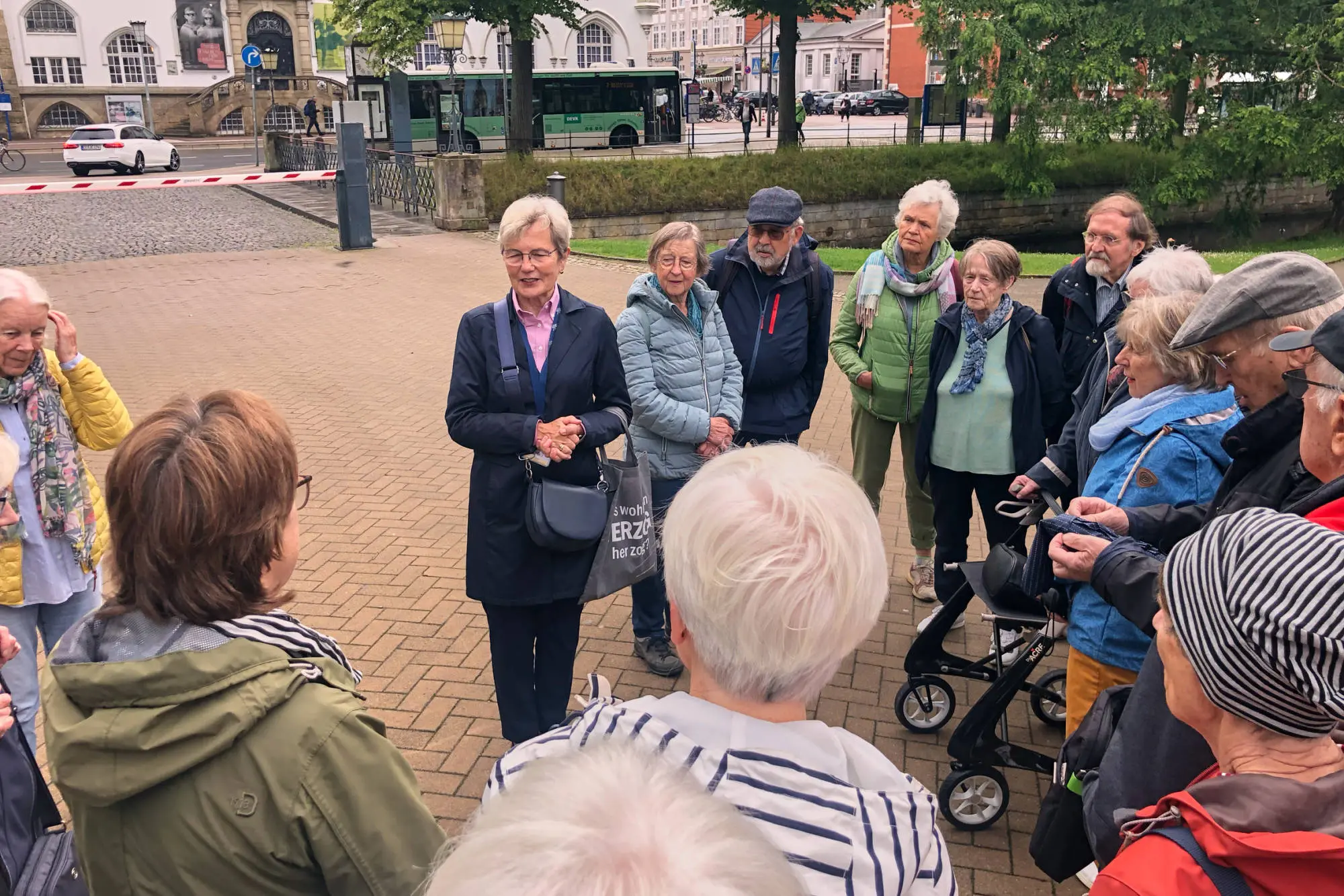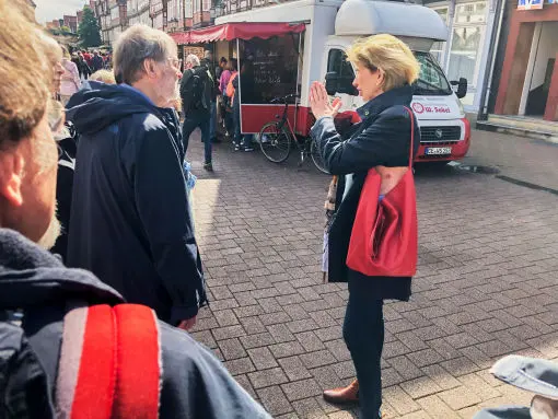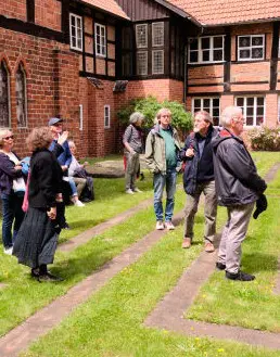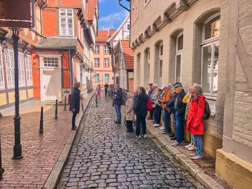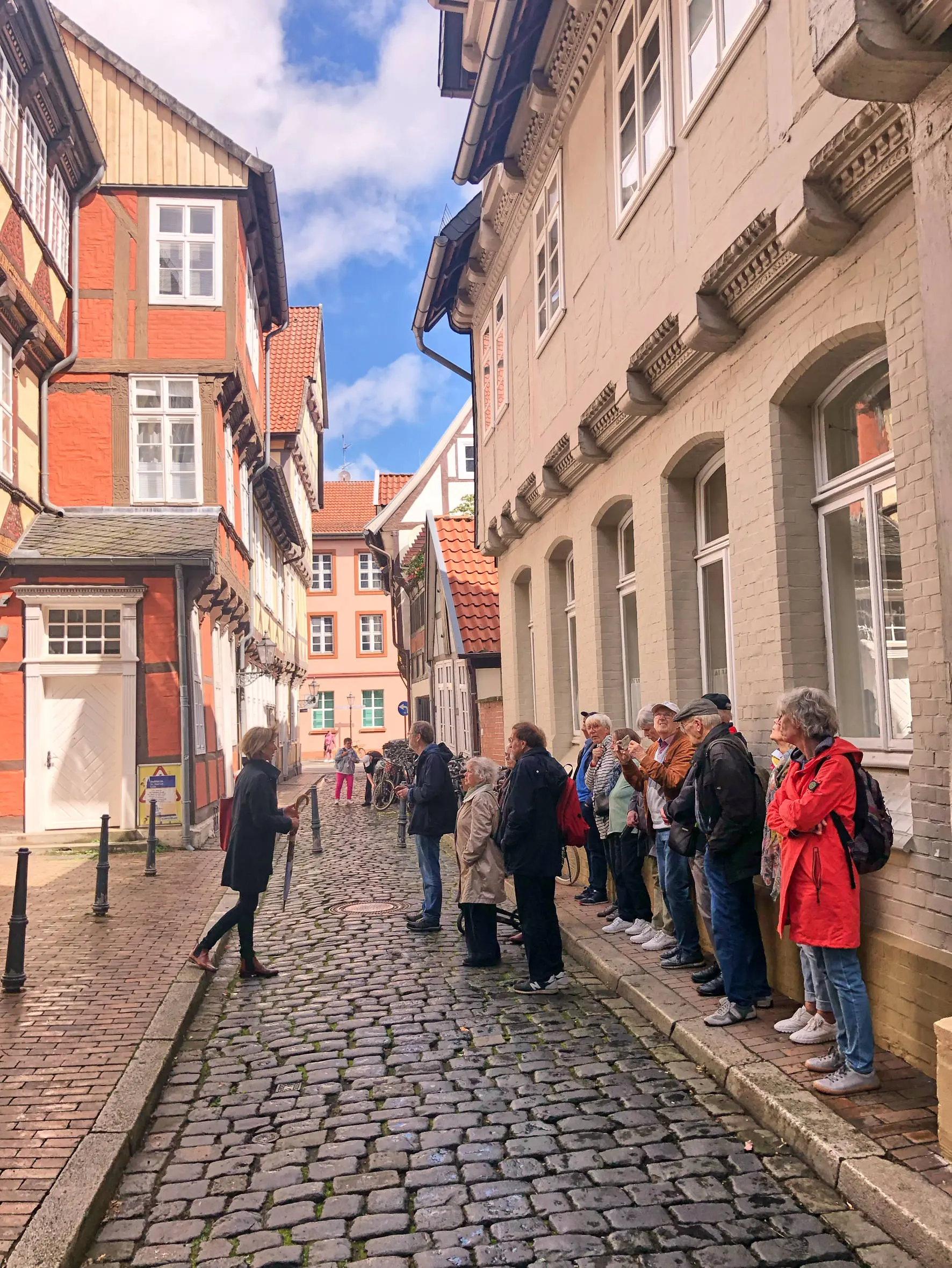 Wie sich das in der Realität anfühlt und welche Hintergründe sich damit verbinden erfuhren die Reiseteilnehmer am zweiten Reisetag morgens bei einer Stadtführung. Neben Details zu den verschiedenen Phasen des Fachwerkbaus gab es auch spannende Informationen zum Leben in einer Lateinschule oder, beim Durchqueren der „Stechbahn“ (dem historischen Ort von Lanzenkämpfen zu Pferd), Hinweise auf den Ursprung von Redensarten wie „für jemanden eine Lanze brechen“ oder „jemanden im Stich lassen“.